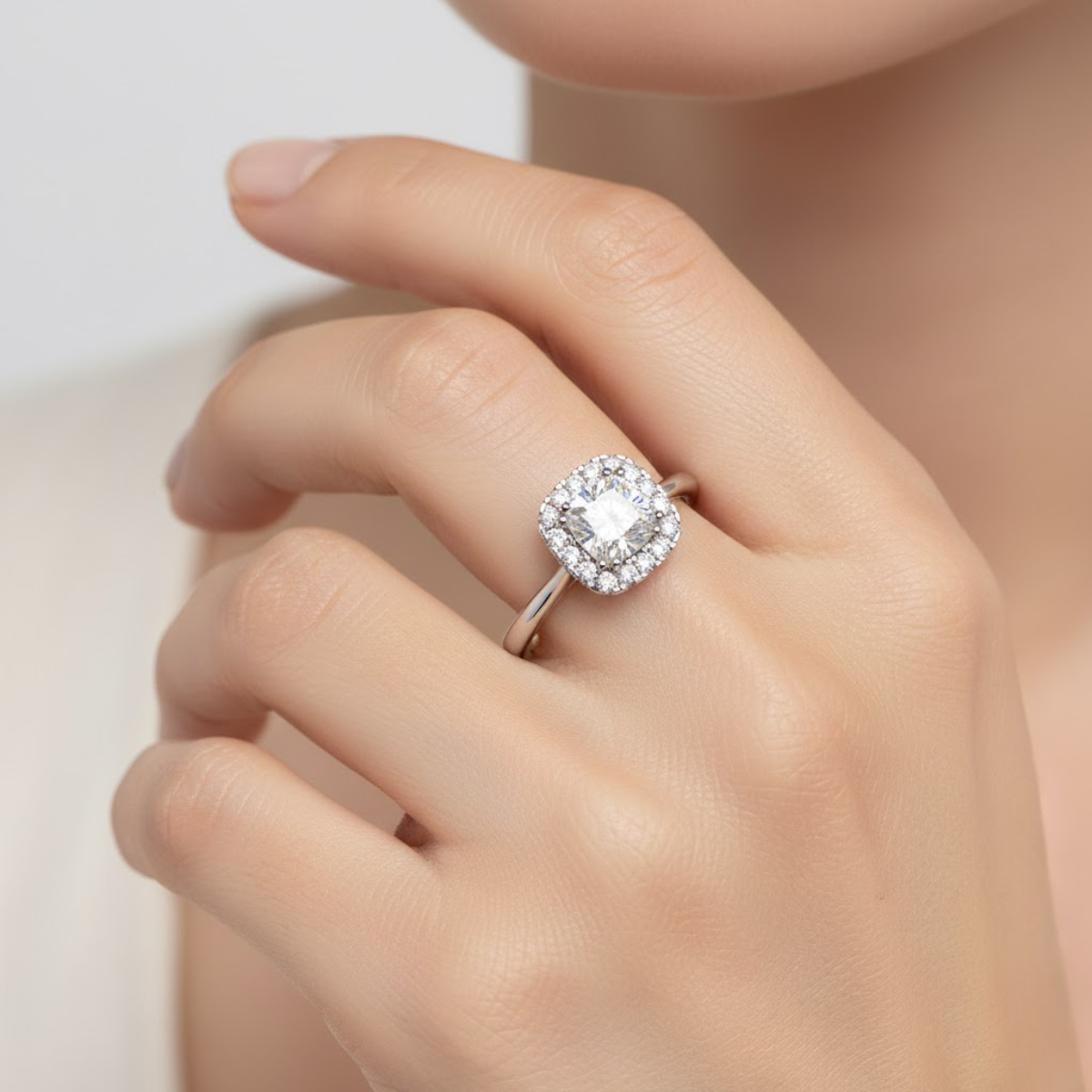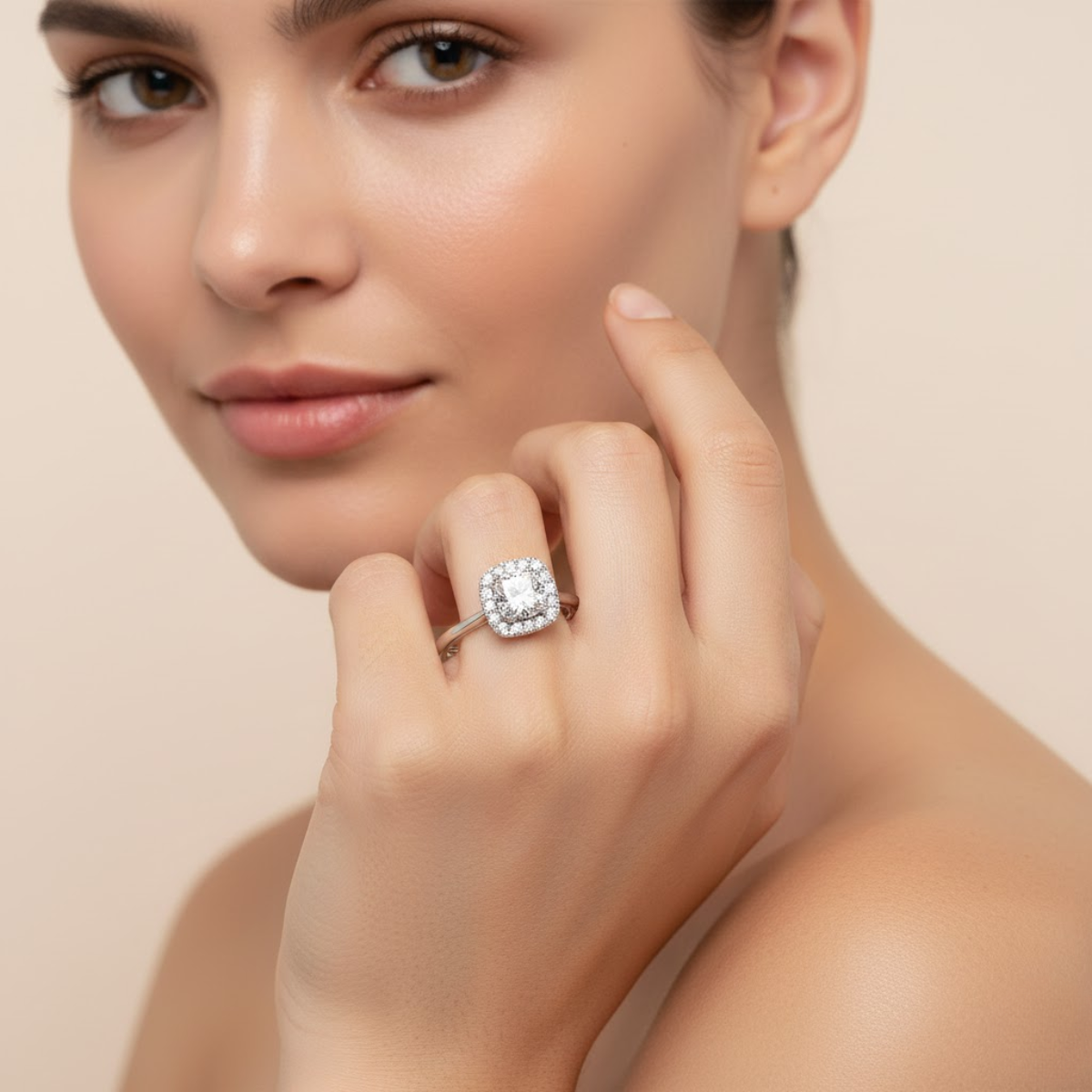 The Halo Solitaire Ring showcases the elegance of a Cushion or Asscher-cut center stone with a luxurious, high-sparkle halo. The center diamond is secured in a refined 4-claw setting enhanced with double claws, giving it exceptional stability while emphasizing the crisp edges and symmetry of the stone.