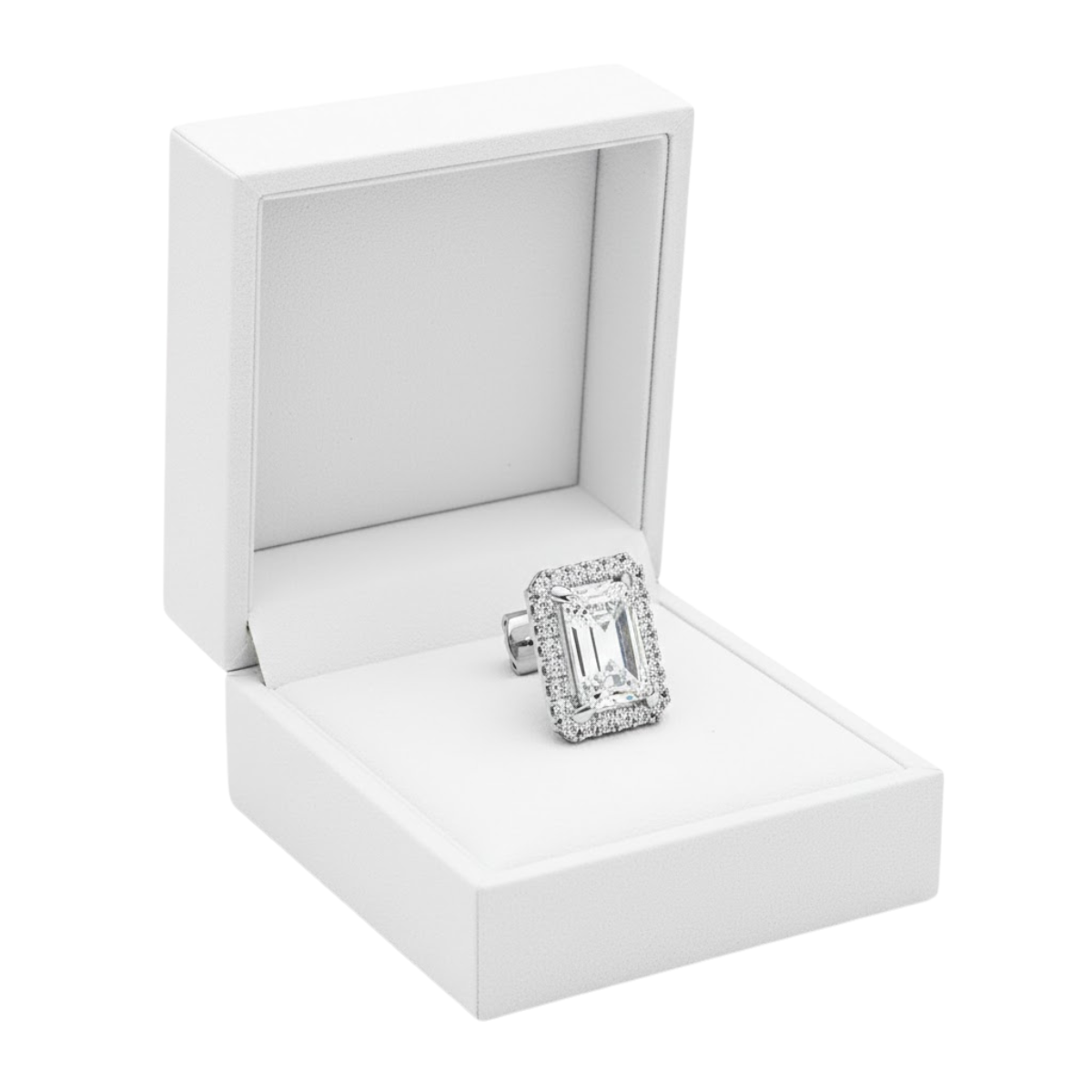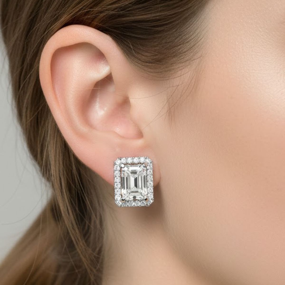 The Elvaris Halo Lineage Stud Earrings present a structured stud design centered on a single emerald-cut diamond, held securely within a 4-claw claw setting. A single halo arranged in a fine micro setting surrounds the center stone, reinforcing its clean geometry while adding measured brilliance.