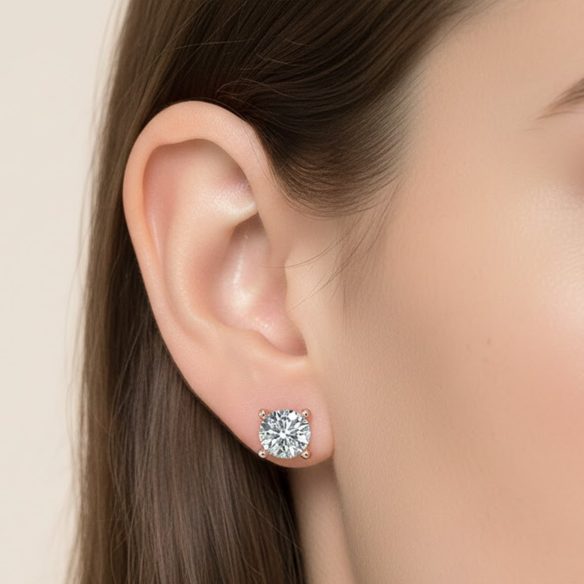 The Veloria Prime Solitaire Studs showcase a refined stud design centered on a single round-cut diamond, held securely in a traditional 4-claw claw setting. The plain mount structure and absence of a halo allow the focus to remain entirely on the center stone, presenting a timeless and understated aesthetic.