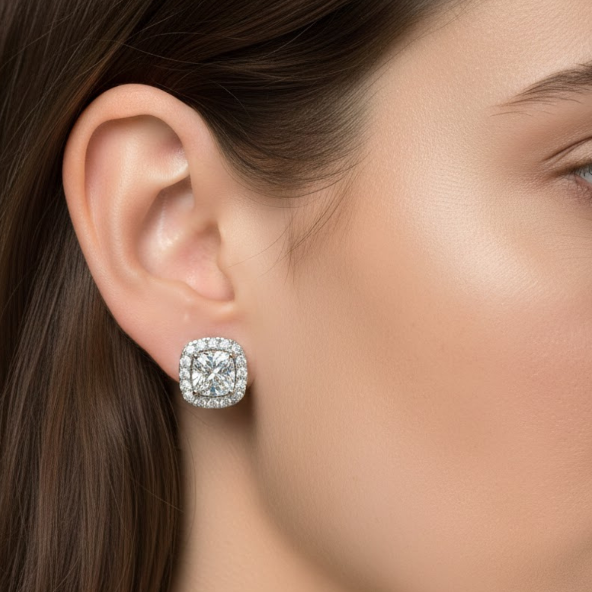 The Avelisse Cushion Halo Diamond Stud Earrings offer a refined balance of classic geometry and modern sparkle. Each earring features a cushion or asscher-shaped diamond, secured in a traditional four-claw setting that enhances the stone’s symmetry and brilliance. Encircling the center diamond, a single halo of micro-set diamonds adds depth and radiant sparkle, creating a sophisticated yet eye-catching silhouette.