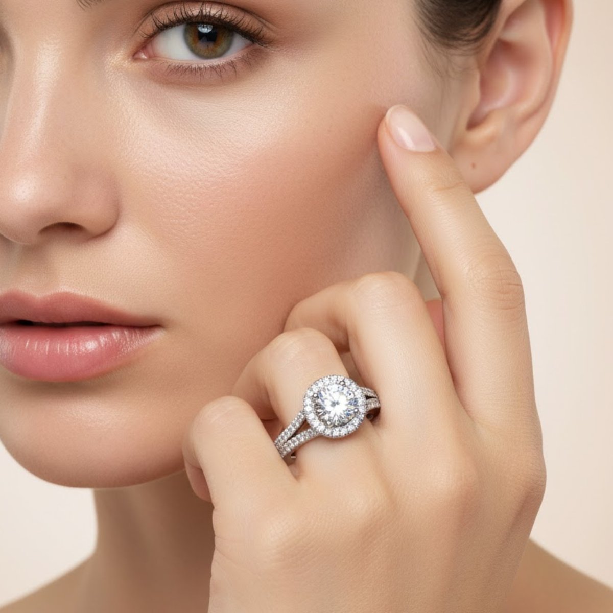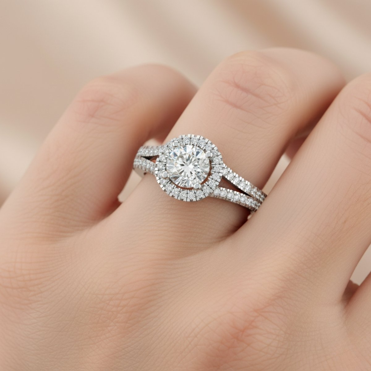 The Luminara Split-Shank Halo Solitaire Ring is a refined expression of modern luxury and timeless brilliance. At its center sits a round brilliant diamond, secured in a classic four-claw setting and framed by a single micro-set halo with a delicate open gap that adds visual depth and elegance. The double-row split shoulders are adorned with micro-set diamonds, creating a sophisticated flow of sparkle that enhances the overall presence of the ring while maintaining a graceful, balanced profile.