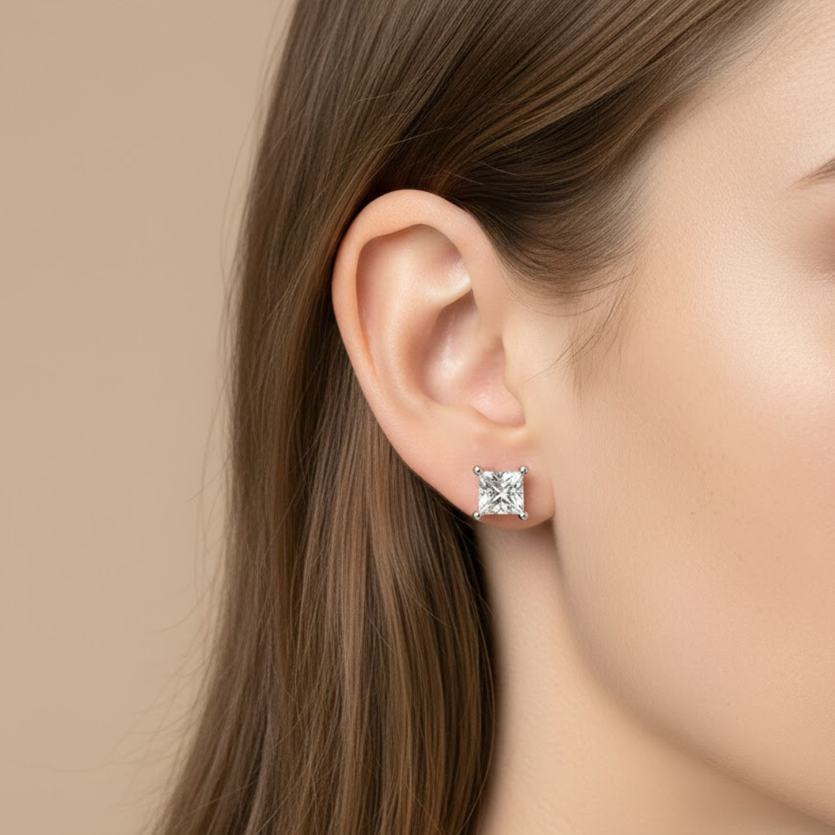 • Elegant stud earrings featuring a princess-cut solitaire diamond