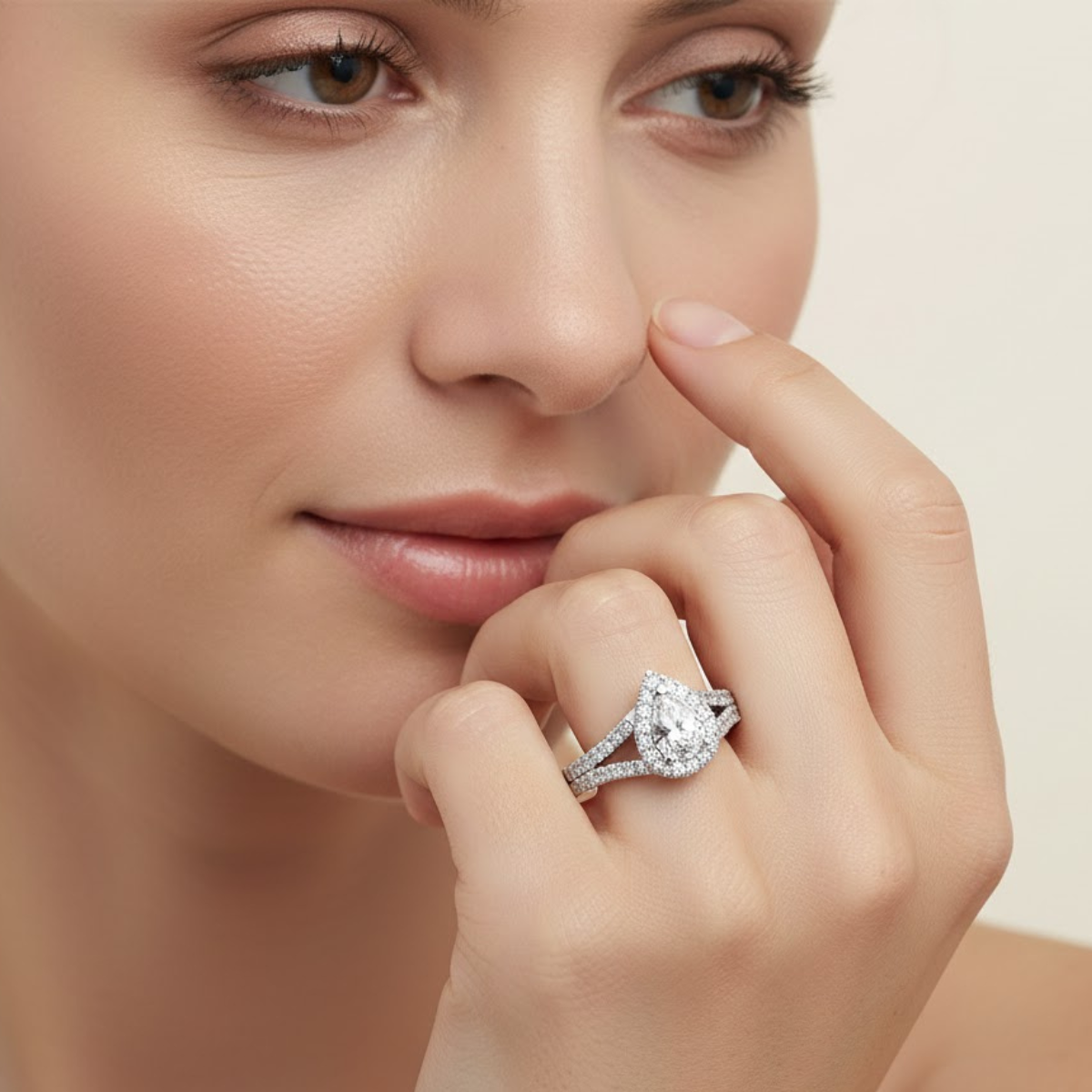 The Aurielle Pear Halo Double-Row Split Shoulder Solitaire Ring is designed to captivate with refined elegance and graceful proportions. At its heart lies a striking pear-shaped centre stone, framed by a seamless single halo of micro-set diamonds that enhances its brilliance without interruption. The tailored pear setting ensures a secure hold while allowing the stone’s unique silhouette to remain the focal point, creating a balanced and luxurious presence on the hand.