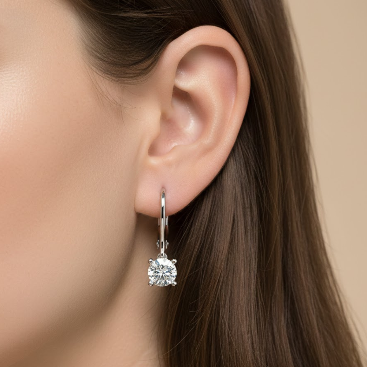 • Elegant drop earrings featuring a round-cut solitaire diamond