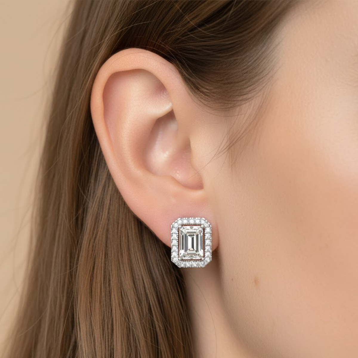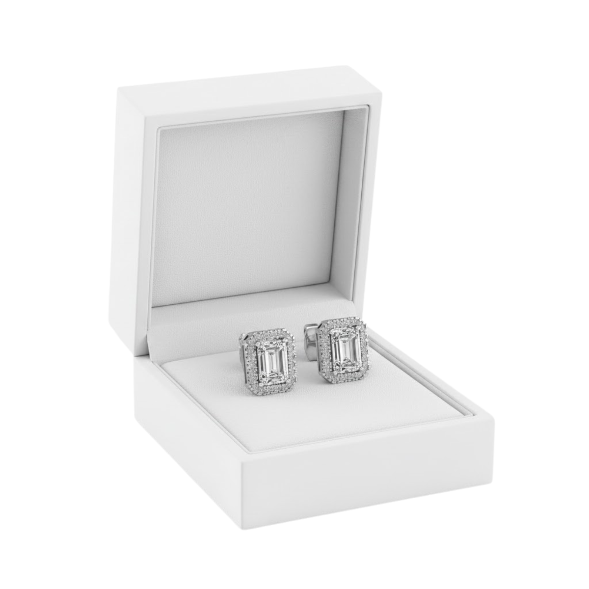 Designed as semi-set stud earrings with fixed findings, this piece offers both visual impact and lasting comfort. The balanced halo design provides added brilliance without overwhelming the emerald-cut diamond’s refined character. Available in rose gold, yellow gold, white gold, these earrings are an ideal choice for those who appreciate clean design, understated luxury, and enduring sophistication.