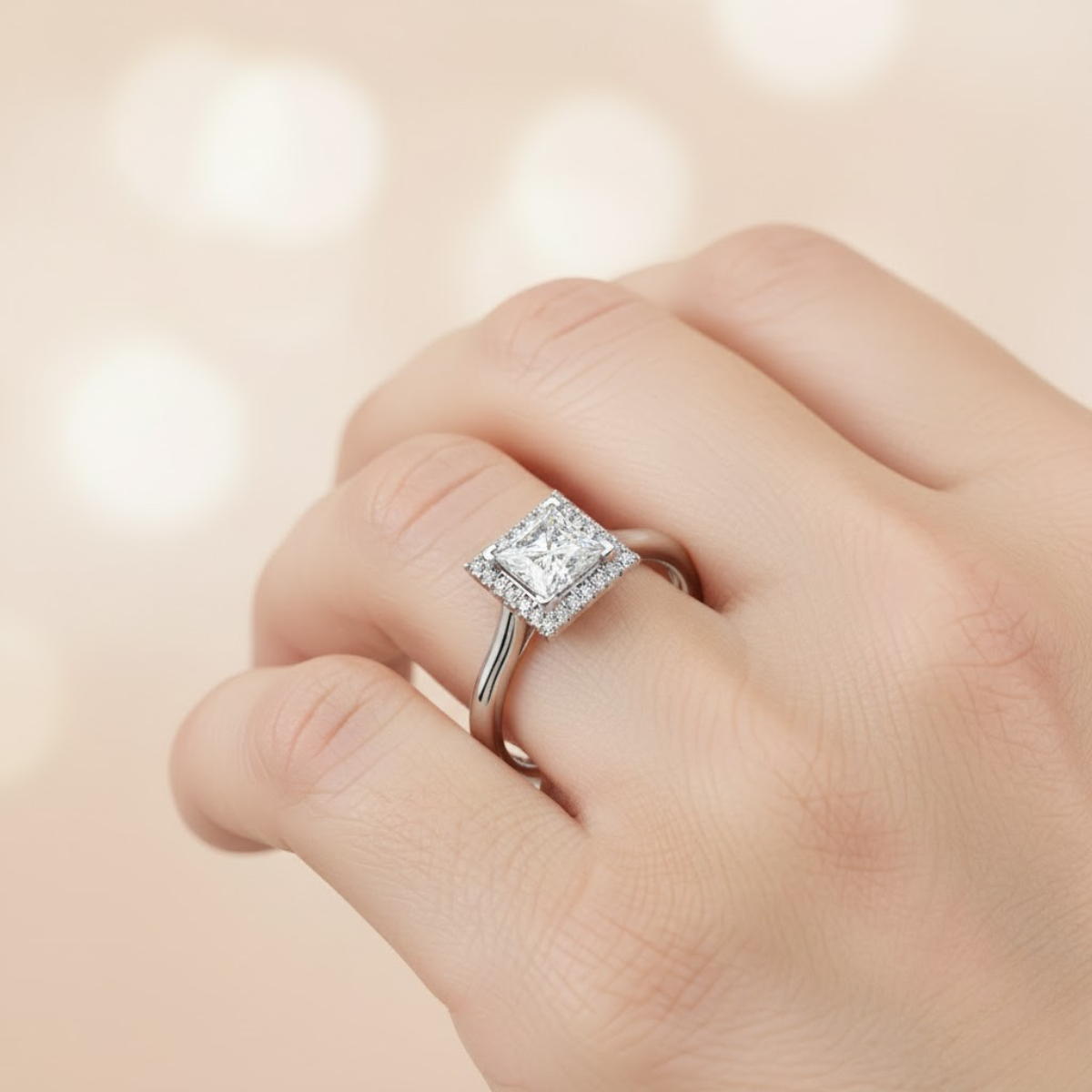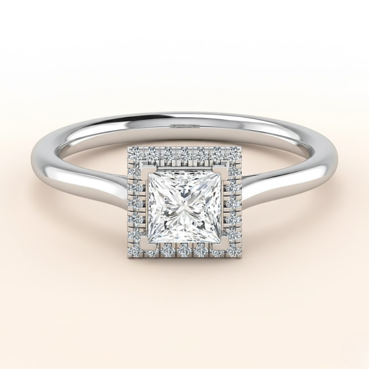 The Princess Halo Perfect-Fit Ring is crafted to enhance the clean, modern elegance of a princess-cut diamond. The center stone is set securely in a refined 4-claw L-shaped setting, designed to protect the edges of the square diamond while allowing plenty of light to enter for maximum brilliance.