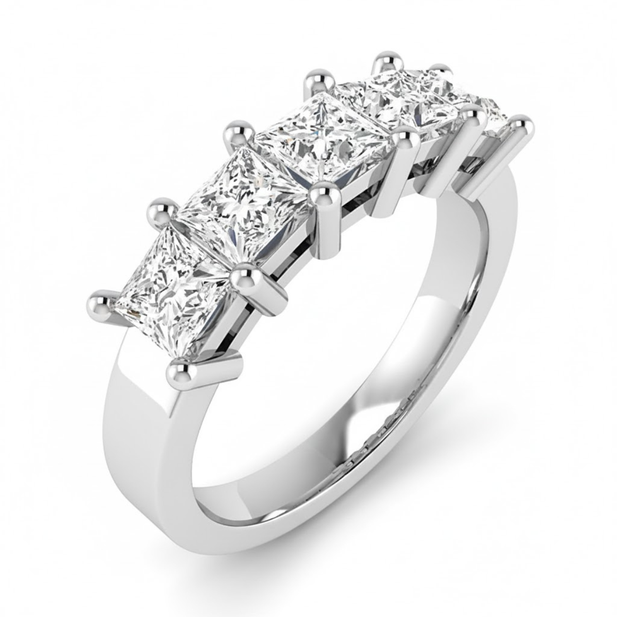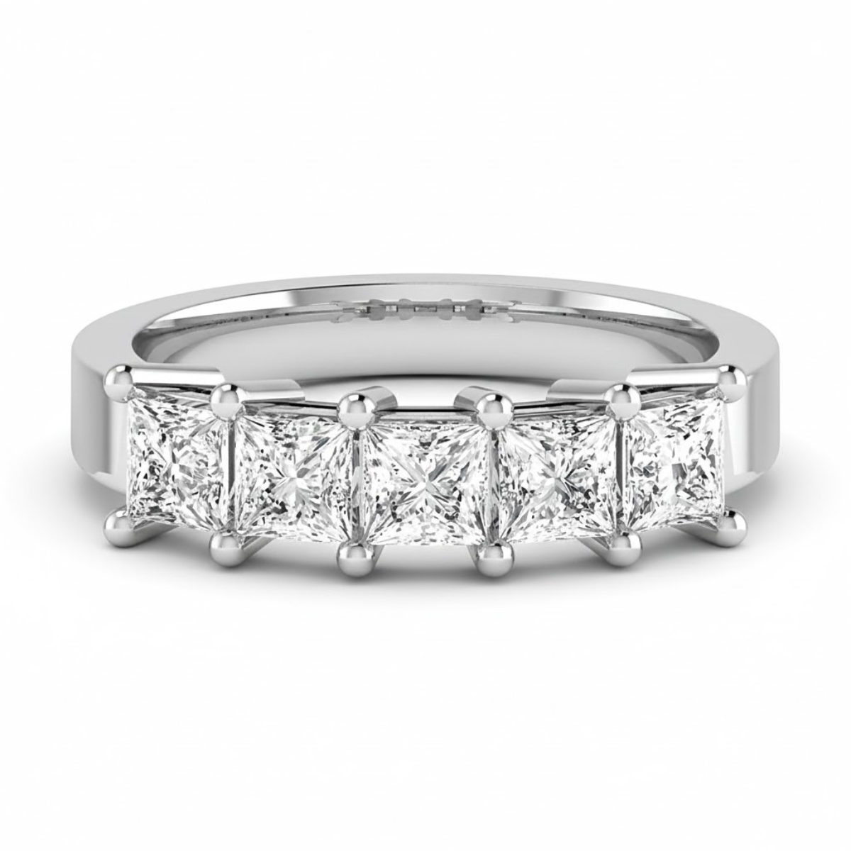 This Princess Five-Stone Uniform Band Five Stone Ring features a bold and elegant arrangement of five princess-cut diamonds set in a clean, straight alignment. The shared-claw setting enhances visual continuity while securely holding each stone, allowing light to pass freely for added brilliance.