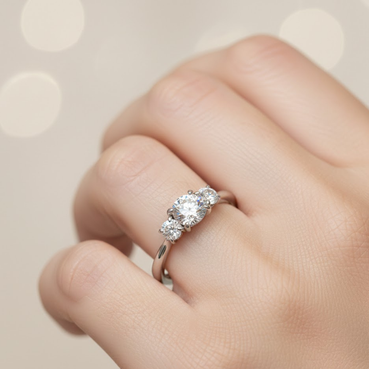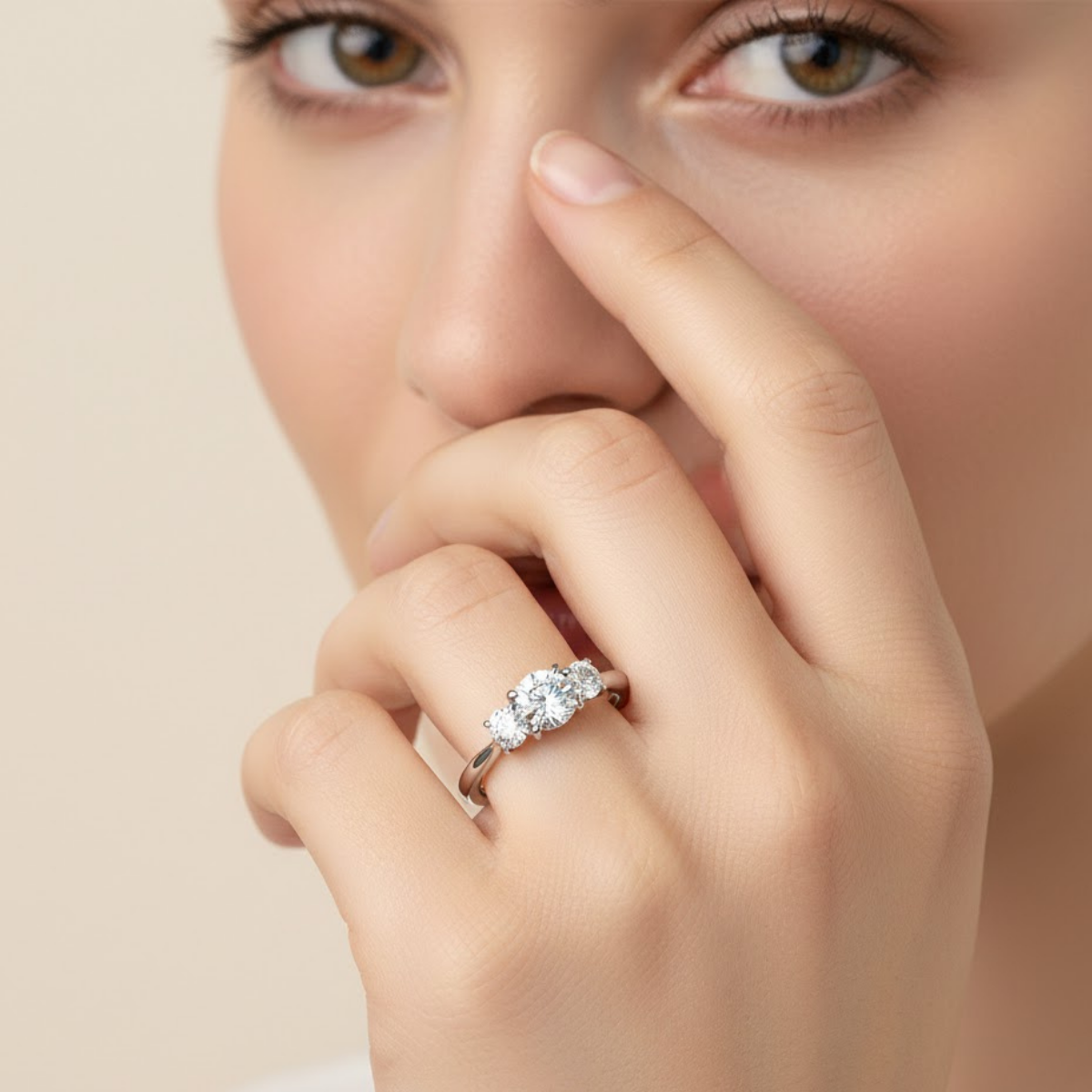 The Triluna Round Tapered Trilogy Ring is a timeless symbol of elegance and meaning, featuring a brilliant round centre stone flanked by two perfectly matched round side stones. Each diamond is secured in a classic four-claw setting that highlights the natural fire and symmetry of the stones, creating a balanced and luminous three-stone composition without the distraction of a halo.
